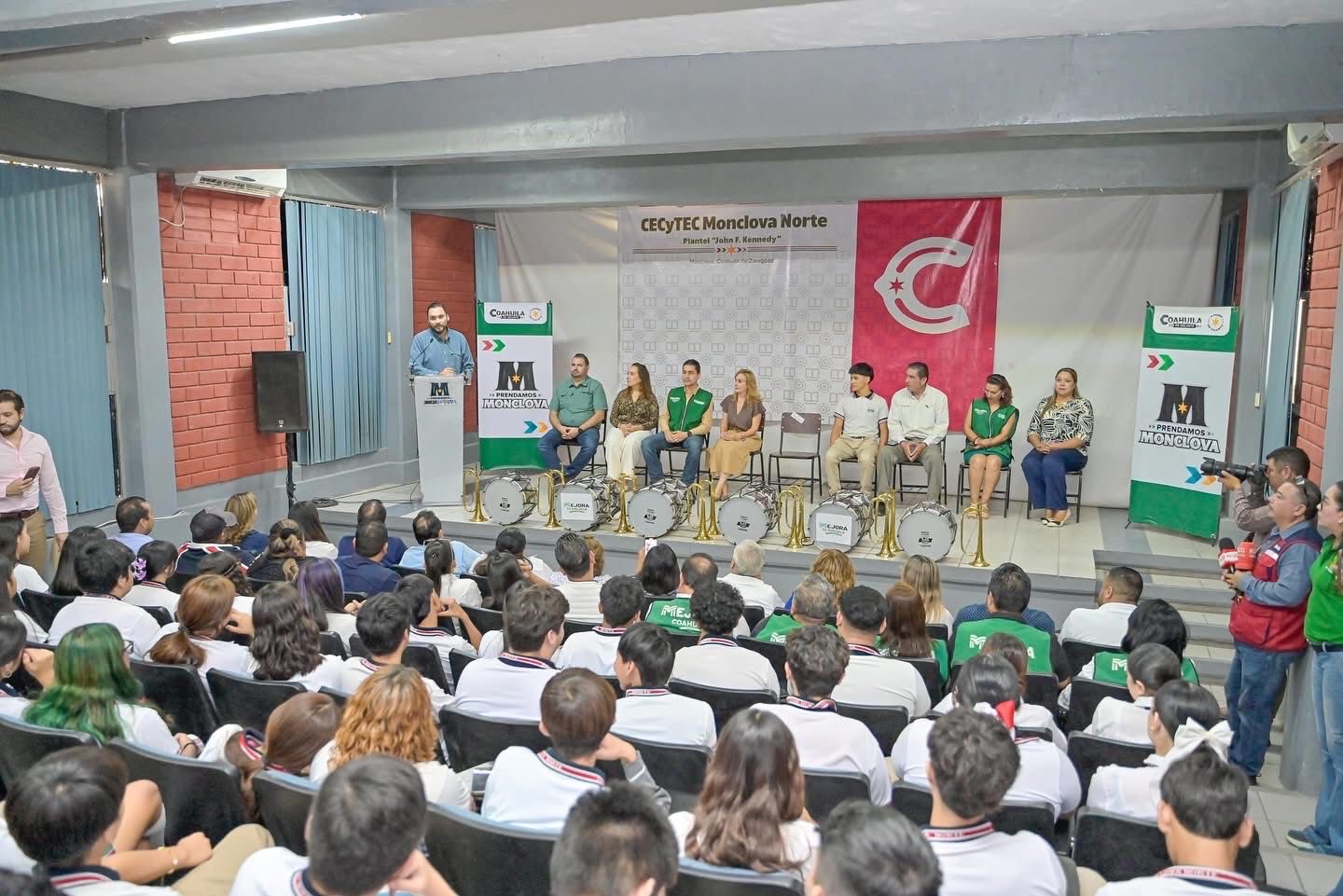 En el CECYTEC Monclova Sur, junto a la directora estatal de CECYTEC, Azucena Ramos, se puso en marcha la construcción de un aula de usos múltiples y obras exteriores, en beneficio de 910 alumnos. Mientras que en el CECYTEC Monclova Norte se arrancó la construcción de un arco techo estructural y obra exterior que mejorarán las condiciones del plantel. Asimismo, gracias a las gestiones de la Subsecretaría de Vinculación de la SEDU, se logró la donación de un equipo completo de Banda de Guerra, compuesto por 12 tambores y 12 trompetas.